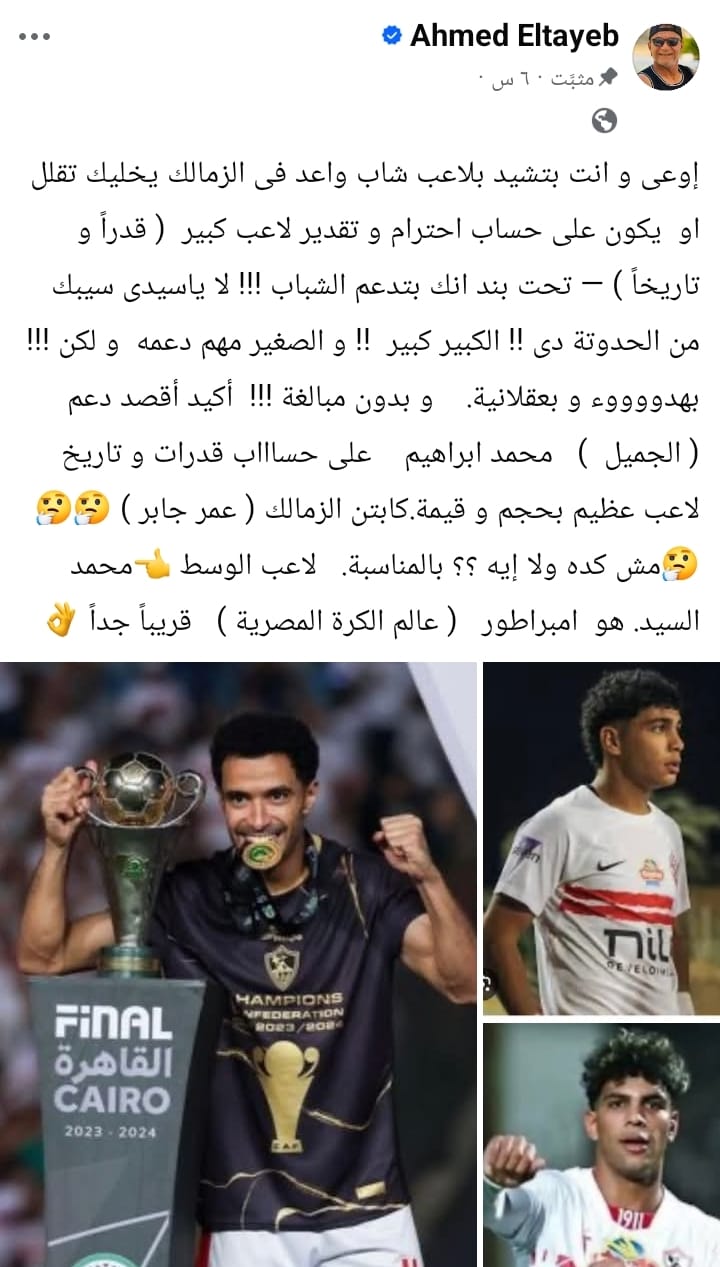 وكتب أحمد الطيب عبر حسابه على فيسبوك "اوعى و أنت بتشيد بلاعب شاب واعد فى الزمالك يخليك تقلل او يكون على حساب احترام و تقدير لاعب كبير ( قدراً و تاريخاً ) تحت بند انك بتدعم الشباب لا ياسيدى سيبك من الحدوتة دى !! الكبير كبير !! و الصغير مهم دعمه و لكن بهدوء و بعقلانية و بدون مبالغة أكيد أقصد دعم "الجميل" محمد ابراهيم على حساب قدرات و تاريخ لاعب عظيم بحجم و قيمة.كابتن الزمالك ( عمر جابر ) مش كده ولا إيه ؟؟ بالمناسبة. لاعب الوسط محمد السيد. هو امبراطور ( عالم الكرة المصرية ) قريباً جداً.