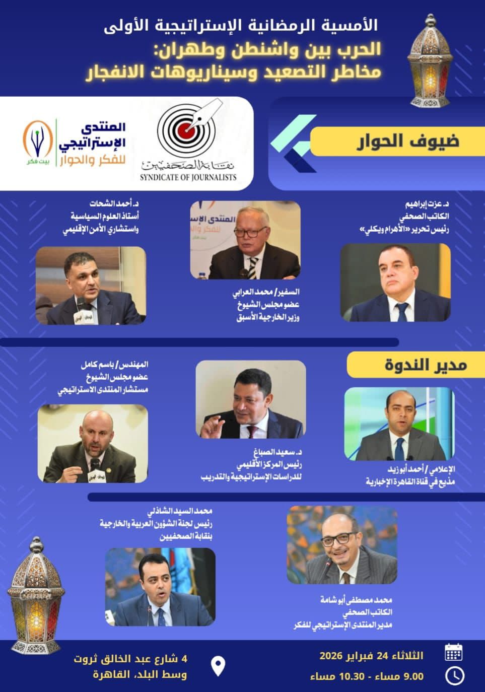 تُنظم لجنة الشئون العربية والخارجية بنقابة الصحفيين، برئاسة محمد السيد الشاذلي، بالتعاون مع المنتدى الاستراتيجي للفكر والحوار، الأمسية الرمضانية الاستراتيجية الأولى، تحت عنوان «الحرب بين واشنطن وطهران.. مخاطر التصعيد وسيناريوهات الانفجار»، وذلك يوم الثلاثاء المقبل في تمام التاسعة مساءً، بقاعة أمين الرافعي في مقر نقابة الصحفيين.