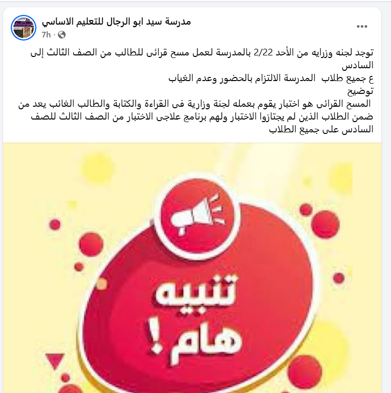 أعلنت الصفحة الرسمية لمدرسة سيد أبو الرجال بمحافظة السويس على موقع التواصل الإجتماعي فيس بوك ، أنها ستستقبل اليوم لجنة وزارية بالمدرسة لعمل مسح قرائي للطلاب من الصف الثالث حتى السادس الابتدائي ، مشددة على ضرورة حضور جميع طلاب اليوم