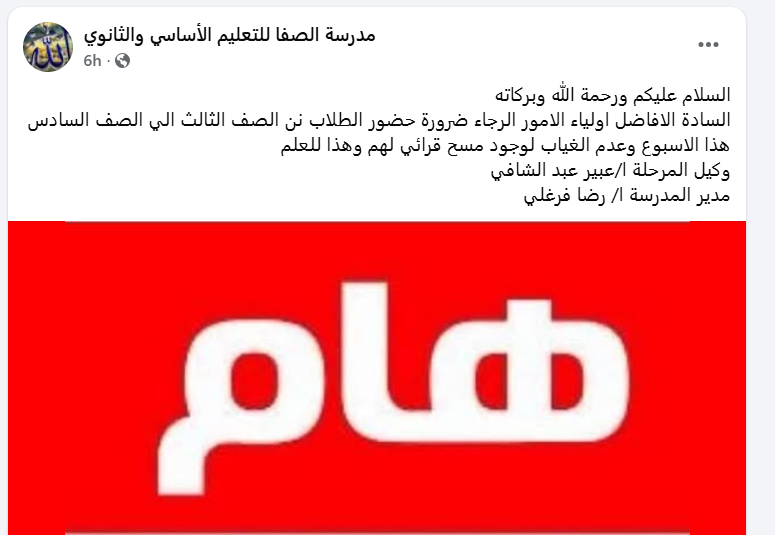 كما نبهت أيضا مدرسة الصفا للتعليم الأساسي ، على ضرورة حضور الطلاب من الصف الثالث حتى الصف السادس الابتدائي هذا الاسبوع وعدم الغياب لوجود مسح قرائي لهم وهذا للعلم