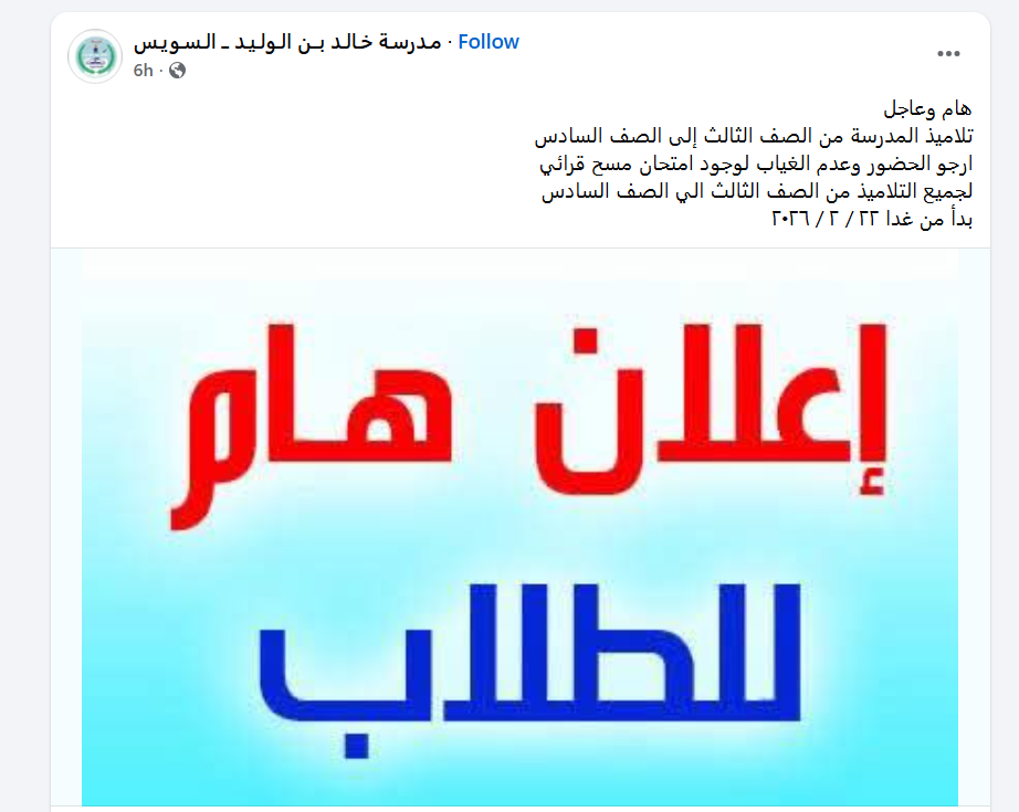 كما أعلنت مدرسة خالد بن الوليد بالسويس ، عن عقد امتحان مسح قرائي لتلاميذ الصفوف من الثالث حتى السادس الابتدائي بدءا من اليوم الاحد 22 فبراير 2026
