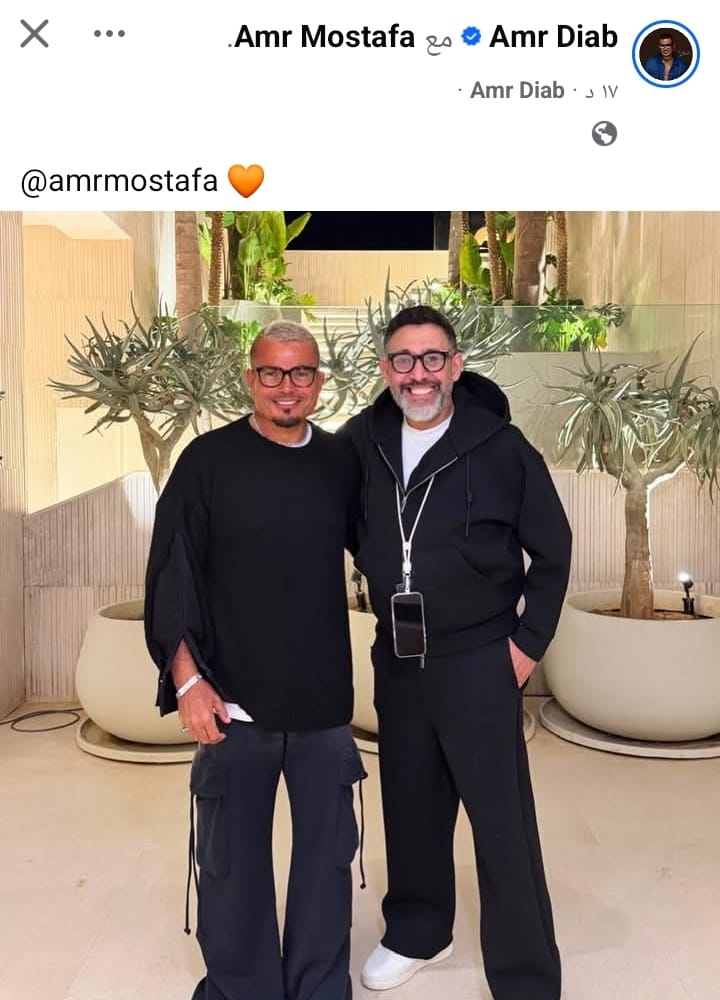 نشر الهضبة عمرو دياب، صورة، عبر صفحته الشخصية بموقع التواصل الاجتماعي "فيس بوك"، جمعته بالملحن عمرو مصطفى، في أحدث ظهور لهما.