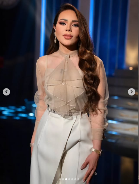 تألقت أسما إبراهيم في الصور بإطلالة كلاسيك، حيث ارتدت بنطلون واسع باللون الأبيض مع بلوزة ذا أكمام طويلة باللون البيج الفاتح واتسمت بالقماش الشفاف.