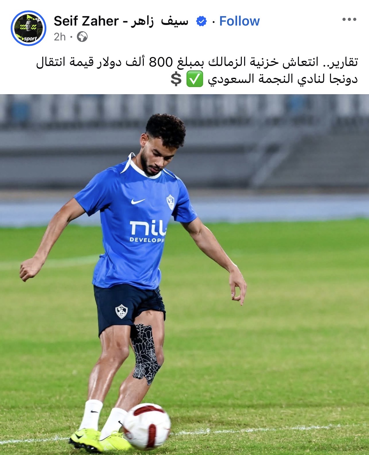 وكتب الإعلامي سيف زاهر عبر حسابه على فيسبوك "تقارير.. انتعاش خزنية الزمالك بمبلغ 800 ألف دولار قيمة انتقال دونجا لنادي النجمة السعودي"