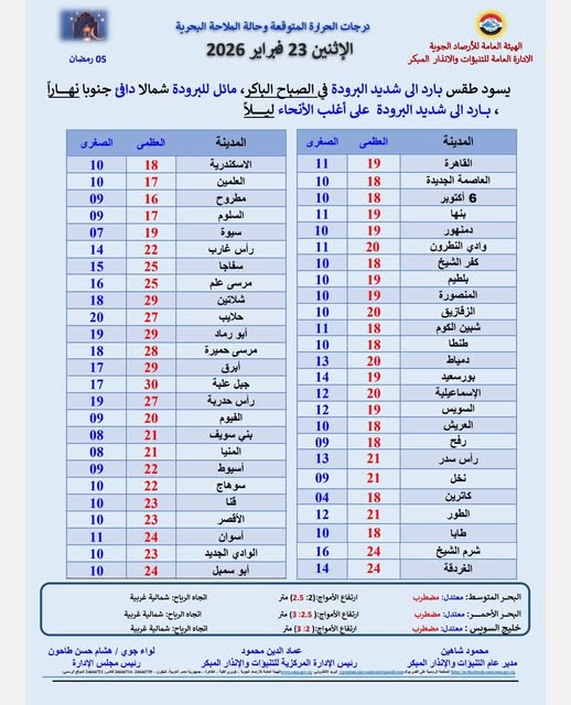 وتوقعت الأرصاد وجود فرص أمطار متفاوتة الشدة على شمال البلاد اليوم الإثنين 23 فبراير، مع حدوث انخفاض فى درجات الحرارة على اغلب الانحاء بقيم تتراوح من (3 - 2) درجة السواحل الشمالية (19:18)، القاهرة الكبرى والوجه البحرى (20:19)، جنوب البلاد (24:21)، ويصاحب ذلك نشاط للرياح على اغلب الأنحاء، وقد تكون مثيرة للرمال والاتربة على مناطق من الصحراء الغربية وشمال وجنوب الصعيد ومحافظة البحر الأحمر.