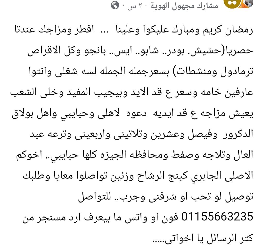وتضمن المنشور كلمات صاحبه" رمضان كريم ومبارك عليكو وعلينا.. افطر ومزاجك عندتا حصريا (حشيش. بودر.. شابو.. ايس.. بانجو وكل الاقراص ترمادول ومنشطات) بسعر جملة الجملة لسه شغلى وانتوا عارفين خامة وسعر ع قد الايد وبيجيب المفيد وخلى الشعب يعيش مزاجه ع قد ايديه دعوة لاهلى وحبايبي واهل بولاق الدكرور وفيصل وعشرين وتلاتينى واربعينى وترعه عبد العال وتلاجه وصفط ومحافظه الجيزه كلها حبايبي.. اخوكم الاصلى الجابري كينج الرشاح وزنين تواصلوا معايا وطلبك توصيل لو تحب او شرفنى وجرب.. للتواصل 01155663235 فون او واتس ما بيعرف ارد مسنجر من كتر الرسائل يا اخواتى".