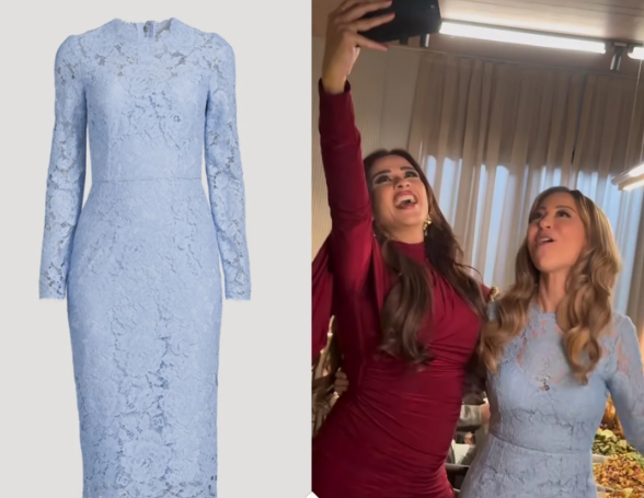 ظهرت منة شلبي في الصور بإطلالة أنثوية بسيطة، حيث ارتدت فستان متوسط الطول وذا أكمام طويلة و اتسم التصميم بالقماش الجبير الراقي ذات اللون البيبي بلو.