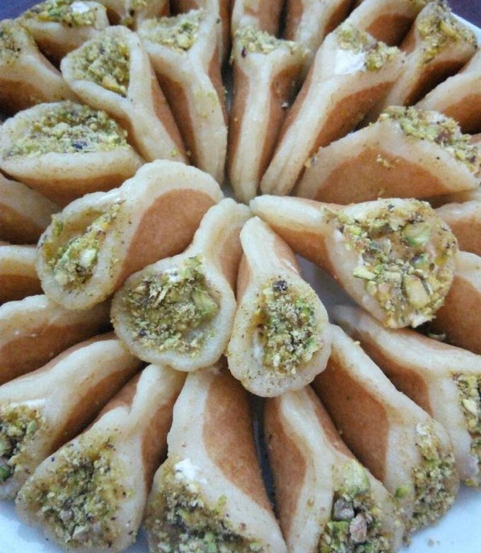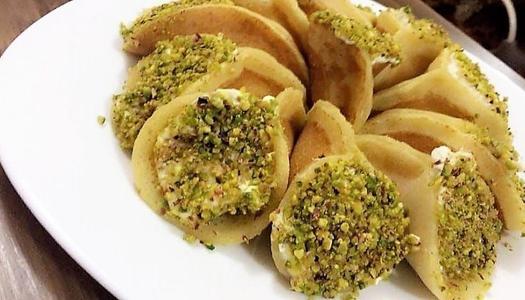 2 تحشى بالقشطة وتغمس الأطراف في الفستق الحلبي المجروش.