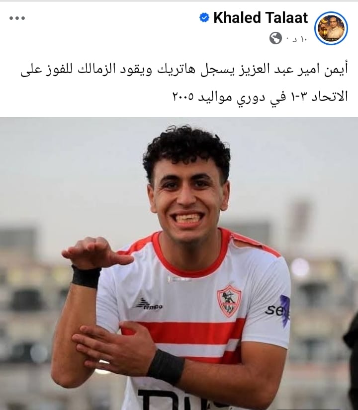 وكتب الناقد الرياضي خالد طلعت، عبر حسابه بموقع التواصل الاجتماعي “فيس بوك”: "أيمن أمير عبد العزيز يسجل هاتريك ويقود الزمالك للفوز على الاتحاد 3-1 في دوري مواليد 2005".