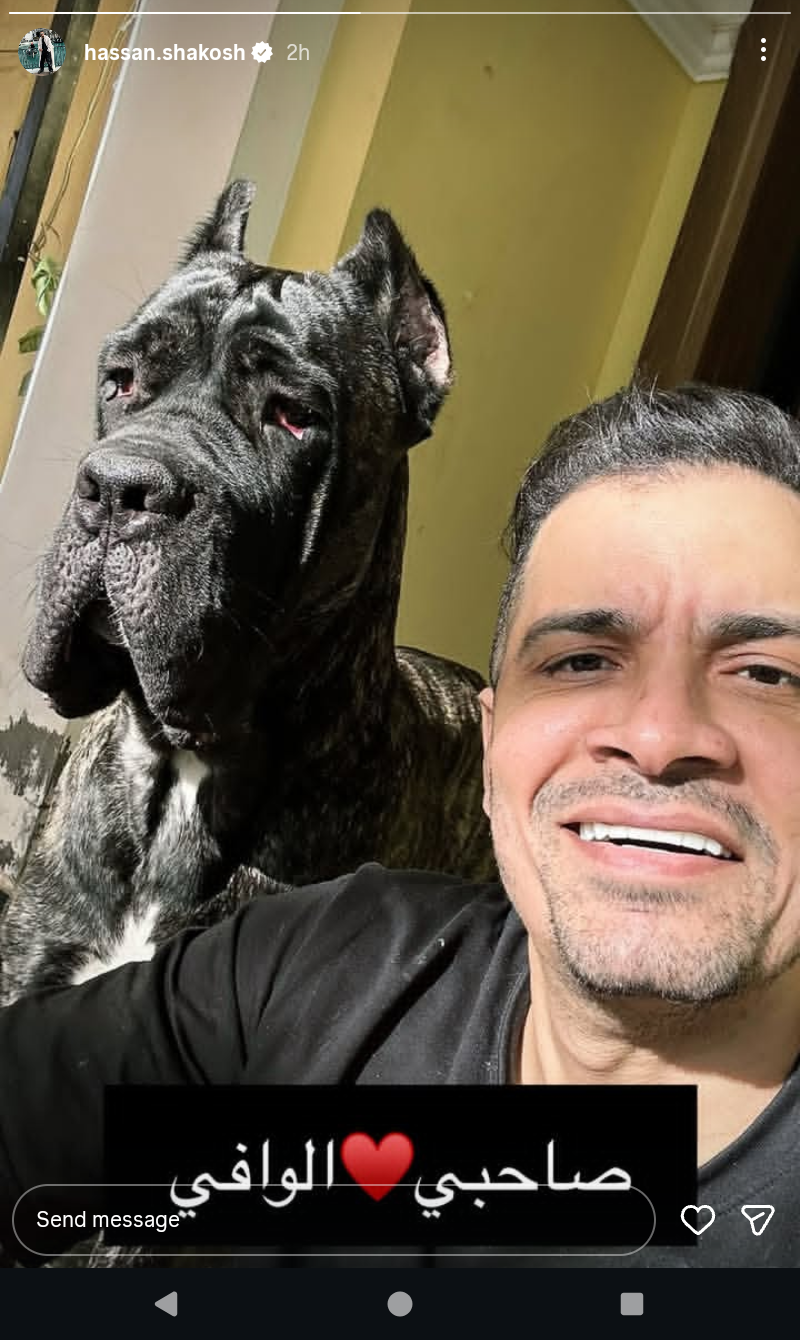 وظهر حسن شاكوش ، في الصورة رفقة كلبة، معلقاً: "كلبي الوفي ".