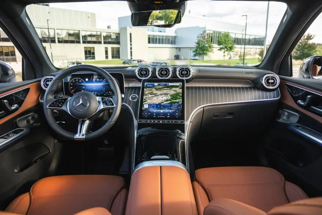 تمتلك سيارة مرسيدس بنز GLC350e موديل 2026 العديد من المميزات من ضمنها، شعارات EQ، وشبكة التهوية الأنيقة، وبها شاشة معلومات وترفيه مركزية مقاس 11.9 بوصة والمائلة قليلاً نحو السائق، وبها لوحة عدادات رقمية مقاس12.3 بوصة، وبها مواد مستخدمة من خشب الأنثراسيت والجلود الفاخرة تعزز من راحة الركاب، وبها إضاءة محيطية محسنة .