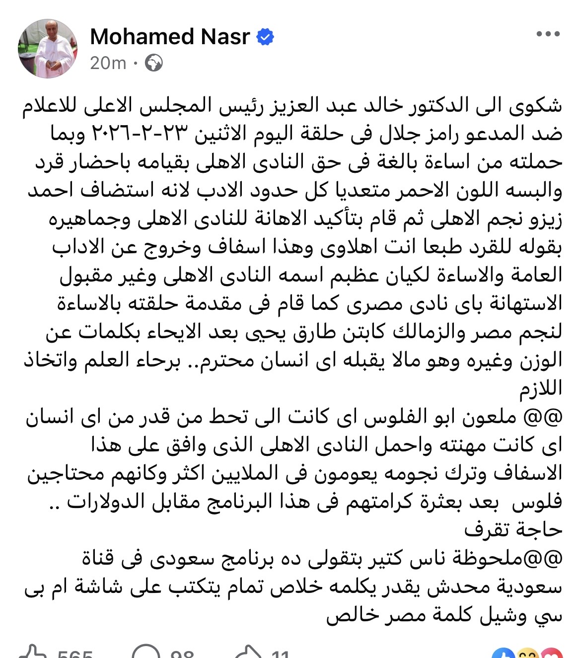 وكتب محمد نصر عبر حسابه على فيسبوك: “شكوى إلى الدكتور خالد عبد العزيز رئيس المجلس الأعلى للإعلام ضد المدعو رامز جلال فى حلقة اليوم الاثنين ٢٣-٢-٢٠٢٦ وبما حملته من إساءة بالغة فى حق النادى الأهلى بقيامه بإحضار قرد وألبسه اللون الأحمر متعديا كل حدود الأدب لأنه استضاف أحمد زيزو نجم الأهلى ثم قام بتأكيد الإهانة للنادى الأهلى وجماهيره بقوله للقرد طبعا أنت أهلاوى وهذا اسفاف وخروج عن الآداب العامة والإساءة لكيان عظبم اسمه النادى الأهلى وغير مقبول الاستهانة بأى نادى مصرى كما قام فى مقدمة حلقته بالإساءة لنجم مصر والزمالك كابتن طارق يحيى بعد الايحاء بكلمات عن الوزن وغيره وهو مالا يقبله أى إنسان محترم.. برحاء العلم واتخاذ اللازم”.