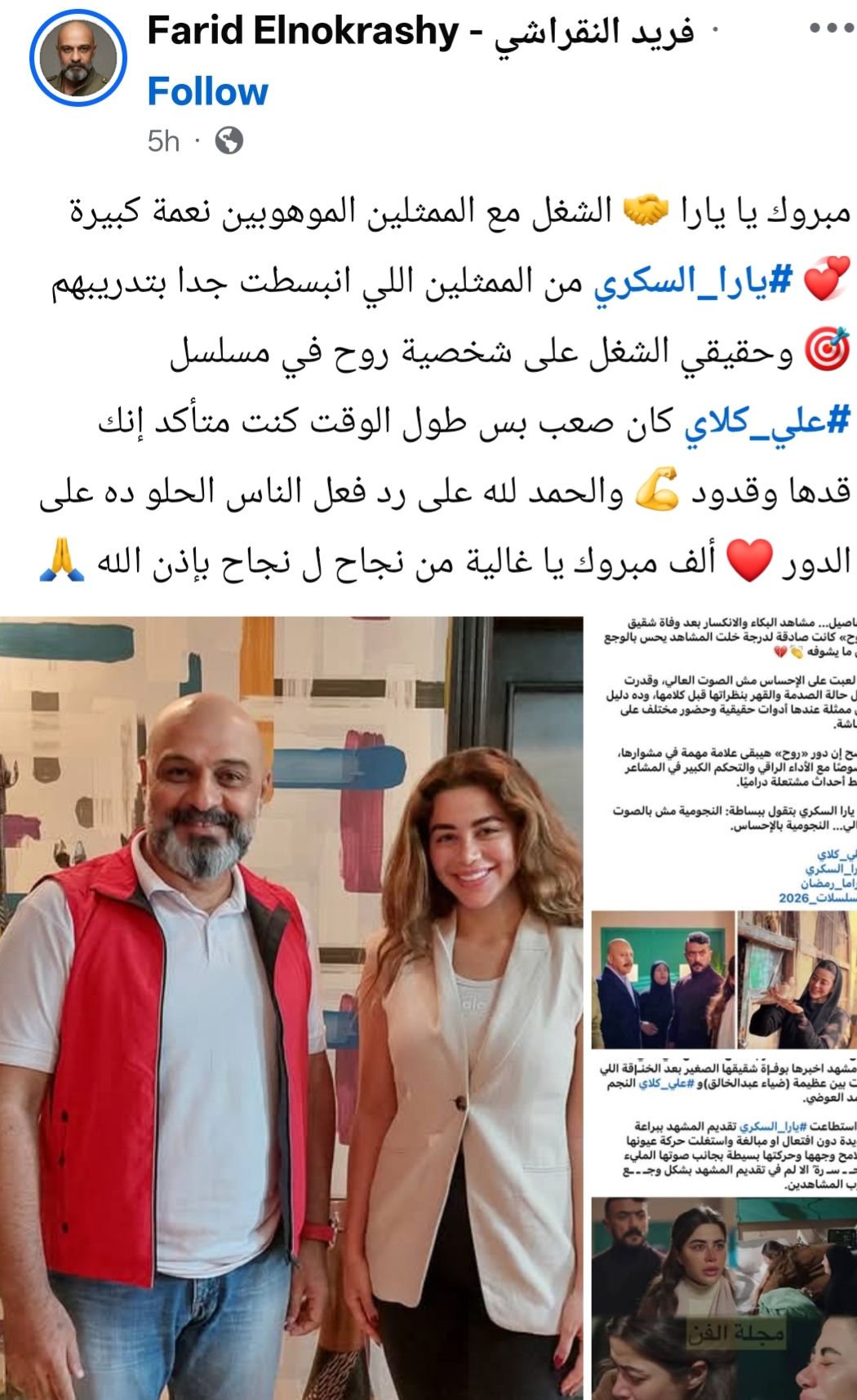 و كتب فريد النقراشي عبر حسابه الشخصي بموقع فيسبوك:مبروك يا يارا الشغل مع الممثلين الموهوبين نعمة كبيرة يارا_السكري من الممثلين اللي انبسطت جدا بتدريبهم وحقيقي الشغل على شخصية روح في مسلسل علي_كلاي كان صعب بس طول الوقت كنت متأكد إنك قدها وقدود والحمد لله على رد فعل الناس الحلو ده على الدور ألف مبروك يا غالية من نجاح ل نجاح بإذن الله.