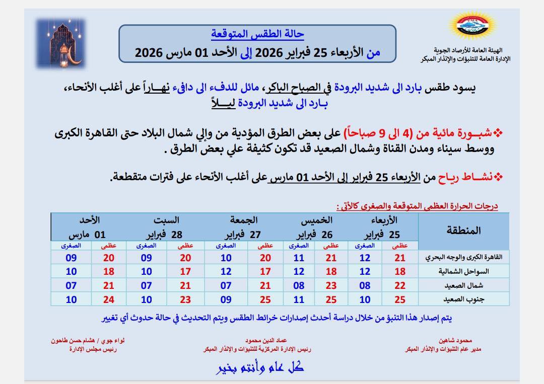 أعلنت الهيئة العامة للأرصاد الجوية عن توقعات حالة الطقس خلال الفترة من الأربعاء 25 فبراير وحتى الأحد 01 مارس 2026.