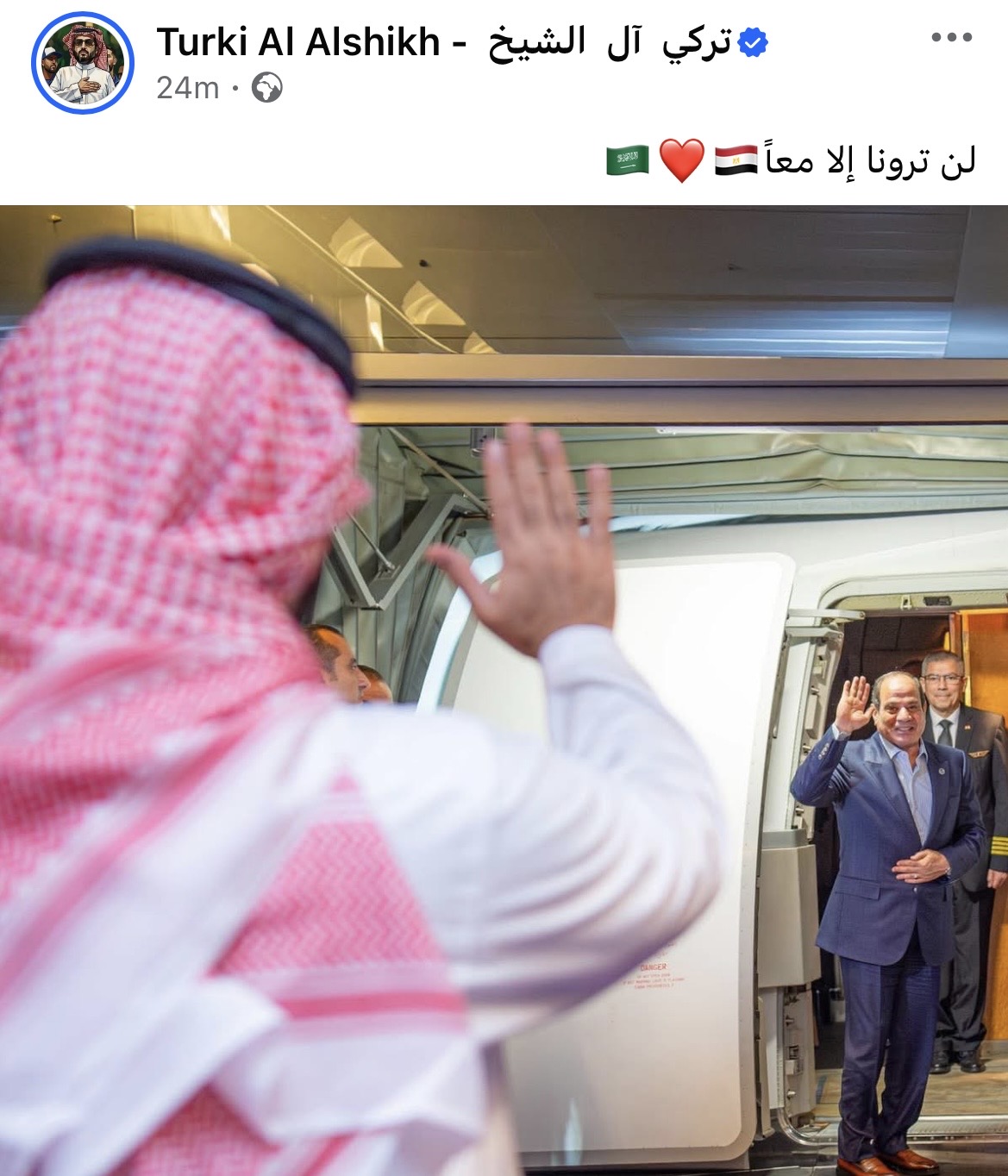 وشارك تركي آل شيخ صورة الرئيس السيسي اثناء مغادرته السعودية، وكتب عبر حسابه على فيسبوك: “لن ترونا إلا معًا”.