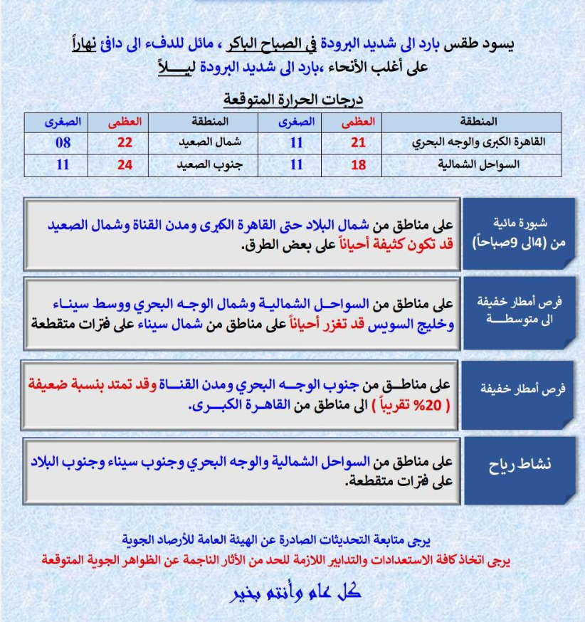 بحسب هيئة الأرصاد، يكون الطقس غدا، فرص أمطار خفيفة على مناطق من جنوب الوجه البحري ومدن القناة، وقد تمتد بنسبة ضعيفة (تصل إلى نحو 20% تقريبًا) إلى مناطق من القاهرة الكبرى.