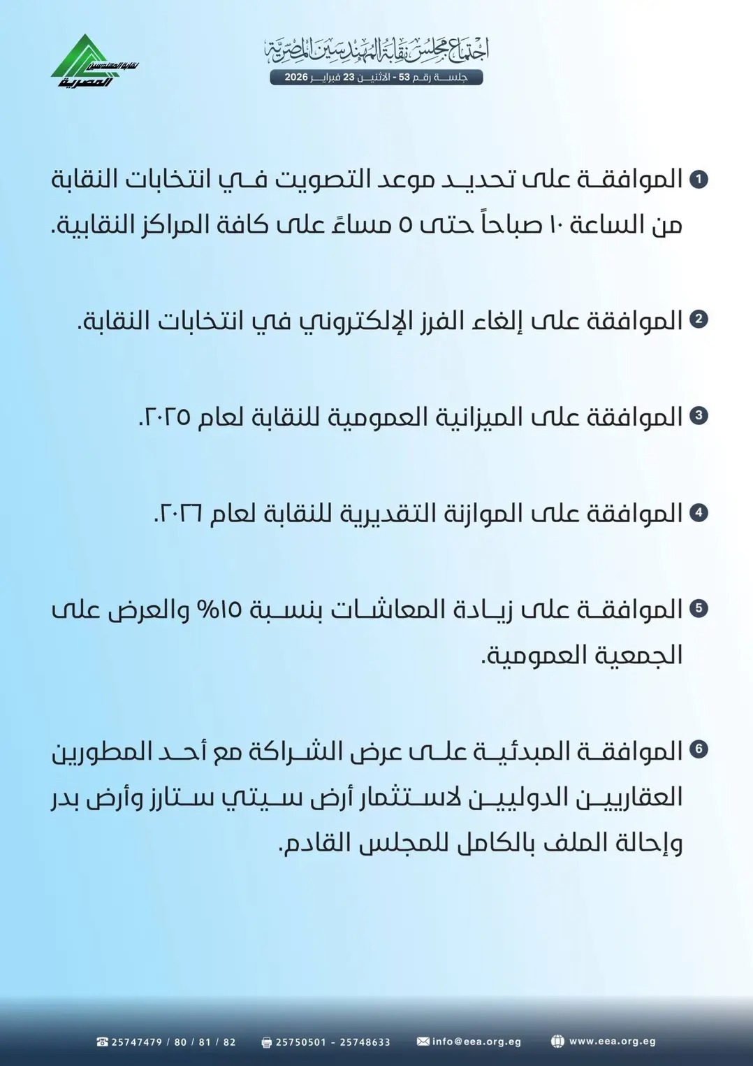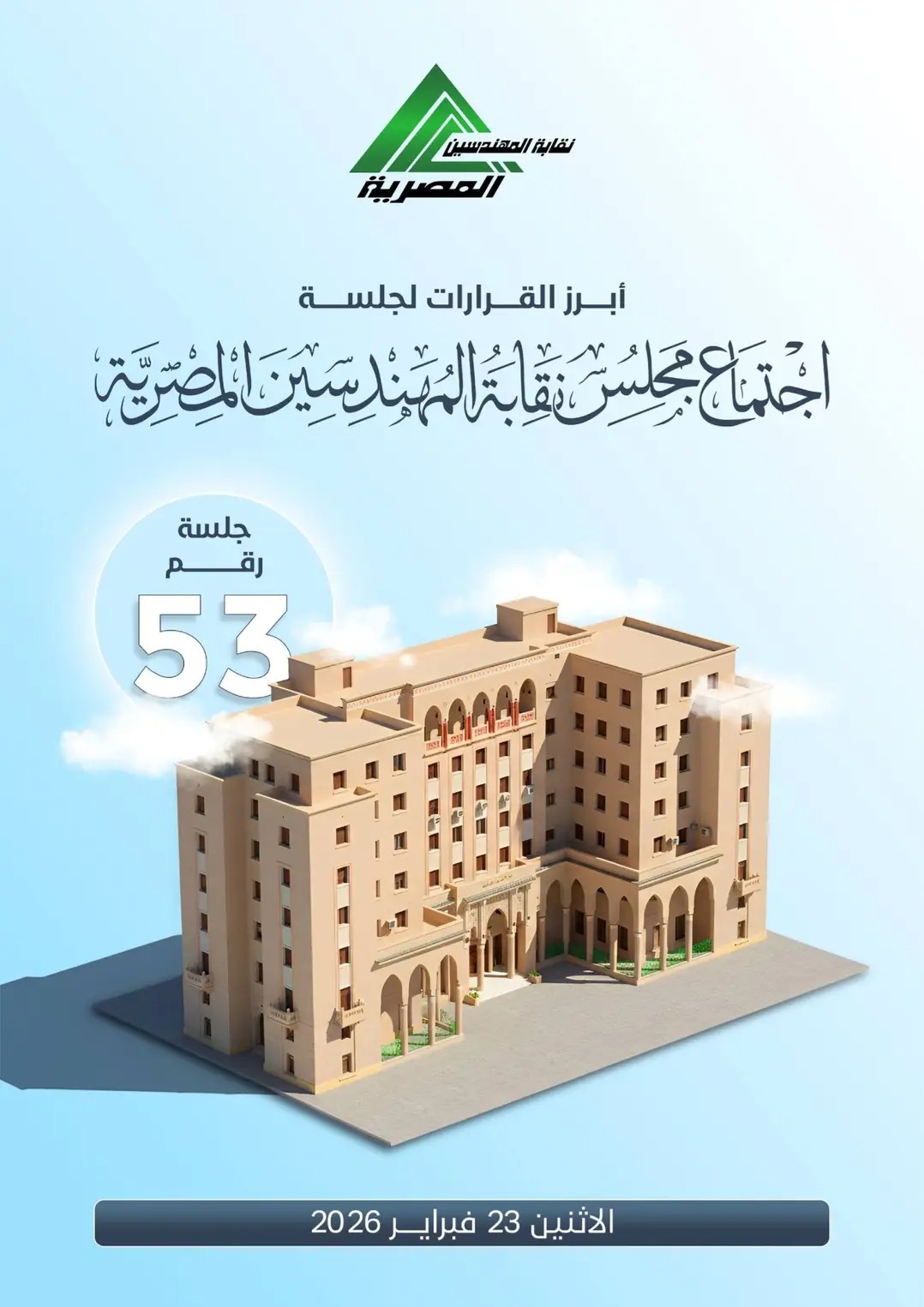 عقد مجلس نقابة المهندسين المصرية، برئاسة المهندس طارق النبراوي، النقيب العام، جلسته رقم (53) يوم الإثنين 23 فبراير 2026، حيث ناقش عددًا من الملفات التنظيمية والمالية والاستثمارية المهمة، واتخذ بشأنها عدة قرارات.