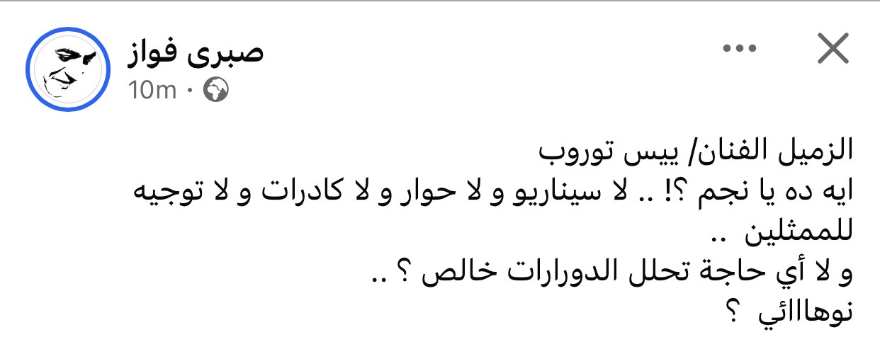 وكتب فواز عبر حسابه على فيسبوك: "الزميل الفنان/ ييس توروب ايه ده يا نجم ؟ .. لا سيناريو و لا حوار و لا كادرات و لا توجيه للممثلين و لا أي حاجة تحلل الدورارات خالص ؟ نوهااائي؟