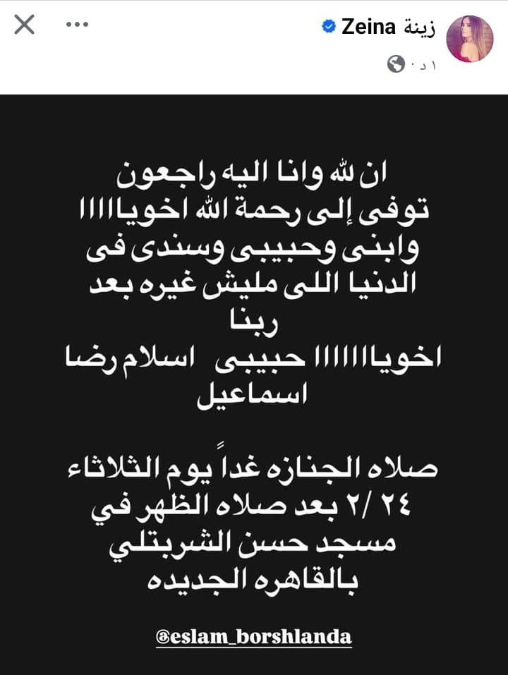 وكتبت زينة في رسالتها المؤثرة:«إنا لله وإنا إليه راجعون.. توفى إلى رحمة الله أخويااااا وابني وحبيبي وسندي في الدنيا اللي مليش غيره بعد ربنا.. أخويا حبيبي إسلام رضا إسماعيل».