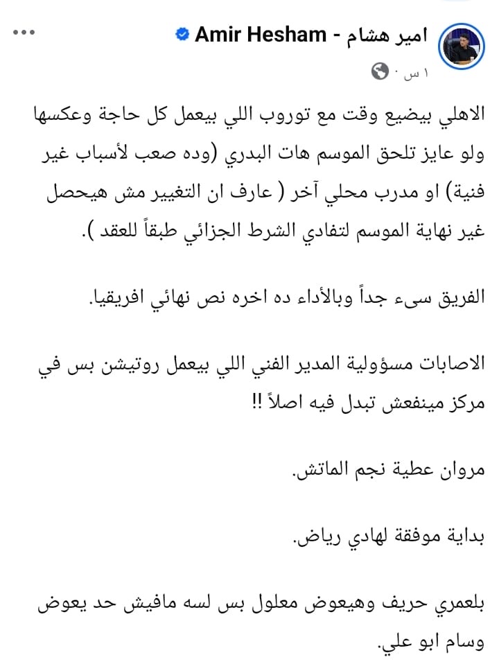وكتب أمير هشام عبر حسابه على فيسبوك: "الأهلي بيضيع الوقت مع توروب، بيعمل كل حاجة وعكسها،لو أراد الاهلي إنقاذ الموسم، يجب التعاقد مع حسام البدري (وهو صعب لأسباب غير فنية) أو مدرب محلي آخر، لكن من المتوقع أن لا يحدث أي تغيير قبل نهاية الموسم لتفادي الشرط الجزائي في العقد".