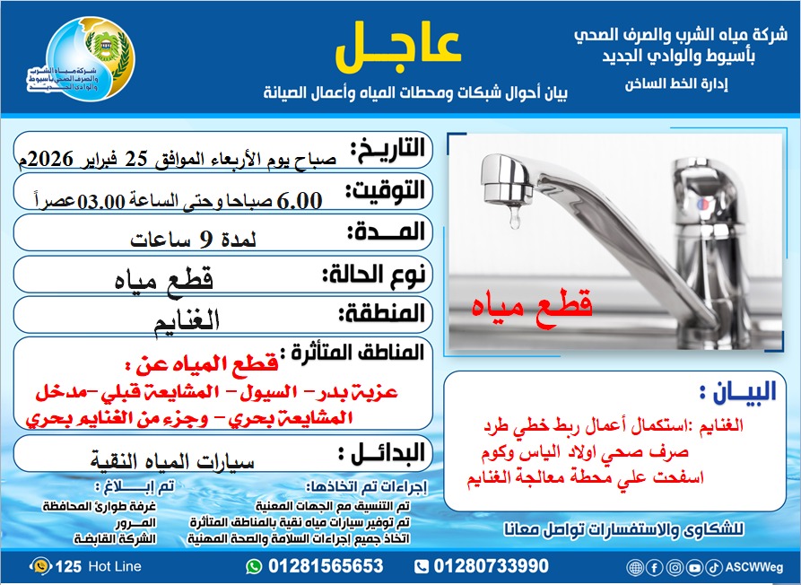وأوضحت الشركة أن تنفيذ هذه الأعمال يستلزم توقف بعض محطات المياه خلال فترة العمل، ما يترتب عليه انقطاع المياه عن عدد من المناطق، تشمل: عزبة بدر، السيول، المشايعة قبلي، مدخل المشايعة بحري، وجزء من الغنايم بحري، مشيرة إلى أن هذه الأعمال تأتي ضمن خطة الشركة لرفع كفاءة منظومة الصرف الصحي وتحسين مستوى الخدمات المقدمة للمواطنين.
