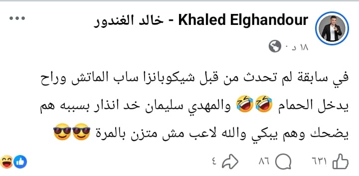 وكتب الغندور عبر حسابه علي فيسبوك: “في سابقة لم تحدث من قبل شيكوبانزا ساب الماتش وراح يدخل الحمام والمهدي سليمان خد إنذار بسببه .. هم يضحك وهم يبكي والله لاعب مش متزن بالمرة”.