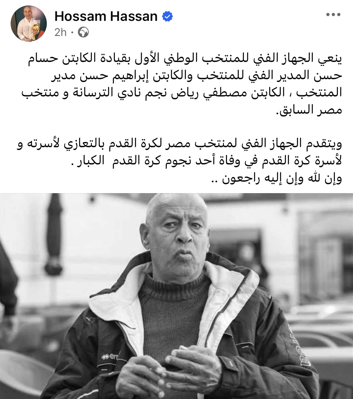 ويتقدّم الجهاز الفني لمنتخب مصر لكرة القدم بالتعازي لأسرته و لأسرة كرة القدم في وفاة أحد نجوم كرة القدم الكبار وإنا لله وإنا إليه راجعون ..