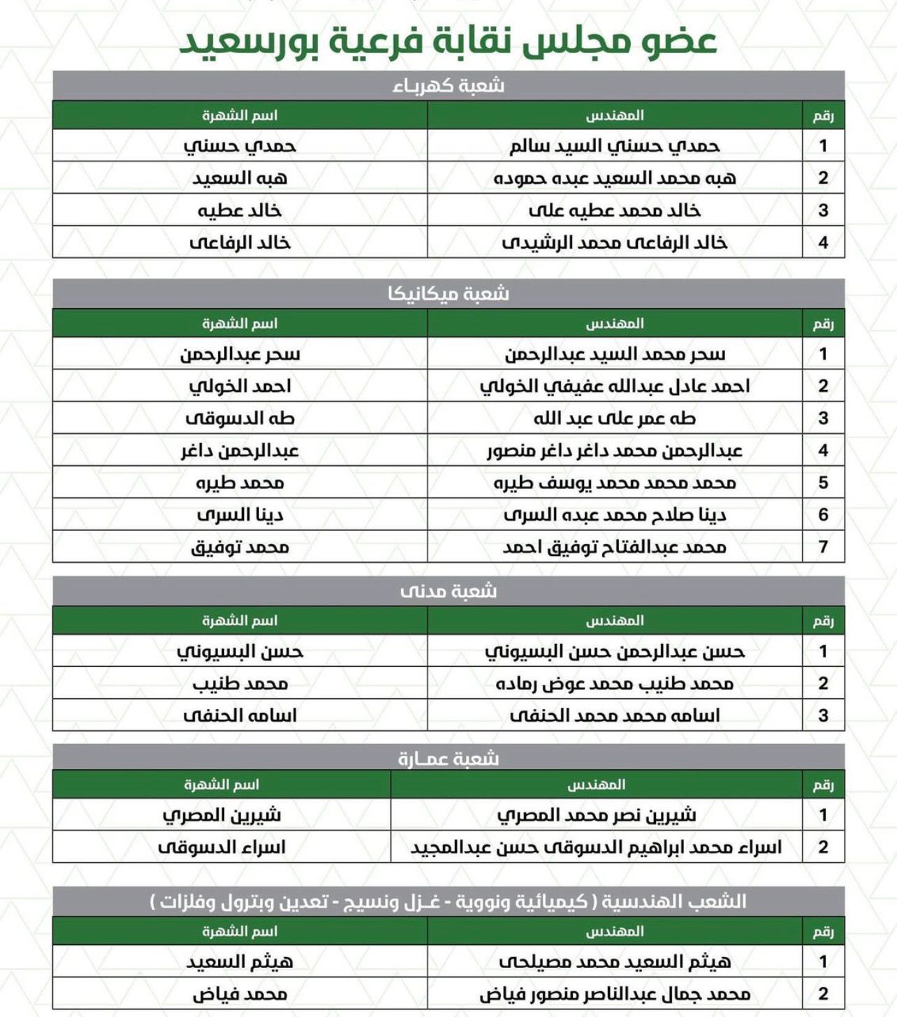 وأشار إلى أن المرشحين على مقعد شعبة كهرباء بعضوية مجلس النقابة الفرعية هم: المهندس حمدي حسني السيد سالم – وشهرته حمدي حسني، والمهندسة هبه محمد السعيد عبده حموده – وشهرتها هبه السعيد، والمهندس خالد محمد عطية علي – وشهرته خالد عطية، والمهندس خالد الرفاعي محمد الرشيدي – وشهرته خالد الرفاعي.