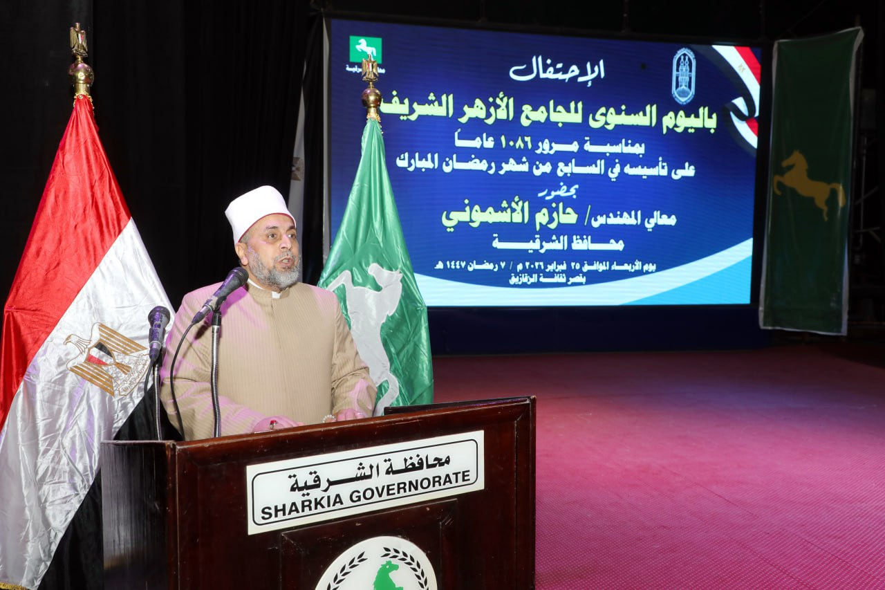 شهد المهندس حازم الأشموني، محافظ الشرقية، الاحتفالية السنوية لتأسيس الجامع الأزهر الشريف لعام ١٤٤٧هـ - ٢٠٢٦م، والتي تأتي هذا العام بمناسبة مرور (١٠٨٦) عامًا على تأسيسه في السابع من شهر رمضان ٣٦١هـ الموافق ٢١ يونيو ٩٧٢م، وذلك في إطار الاحتفالات التي تُحيي تراث مصر الإسلامي والعلمي، والتي نظمتها المنطقة الأزهرية بالشرقية بقصر ثقافة الزقازيق.