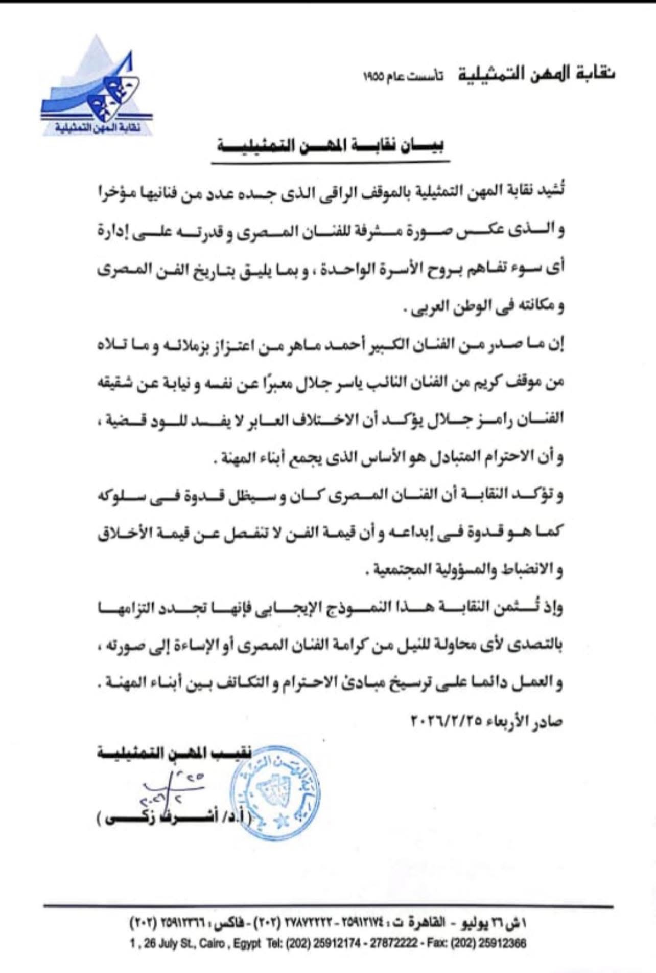 "تشيد نقابة المهن التمثيلية بالموقف الراقى الذى جسده عدد من فنانيها مؤخرا،