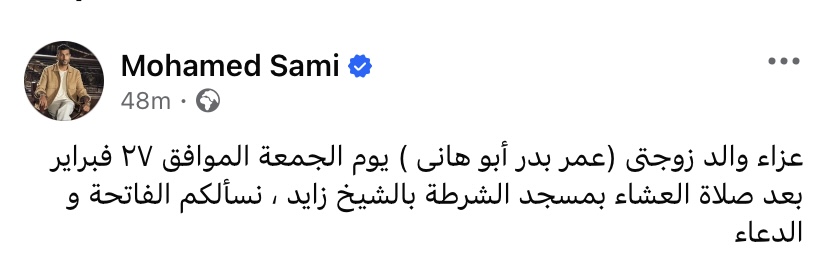 وقال محمد سامي عبر حسابه بموقع التواصل الاجتماعي فيسبوك:"عزاء والد زوجتى (عمر بدر أبو هانى ) يوم الجمعة الموافق ٢٧ فبراير بعد صلاة العشاء بمسجد الشرطة بالشيخ زايد ، نسألكم الفاتحة و الدعاء".