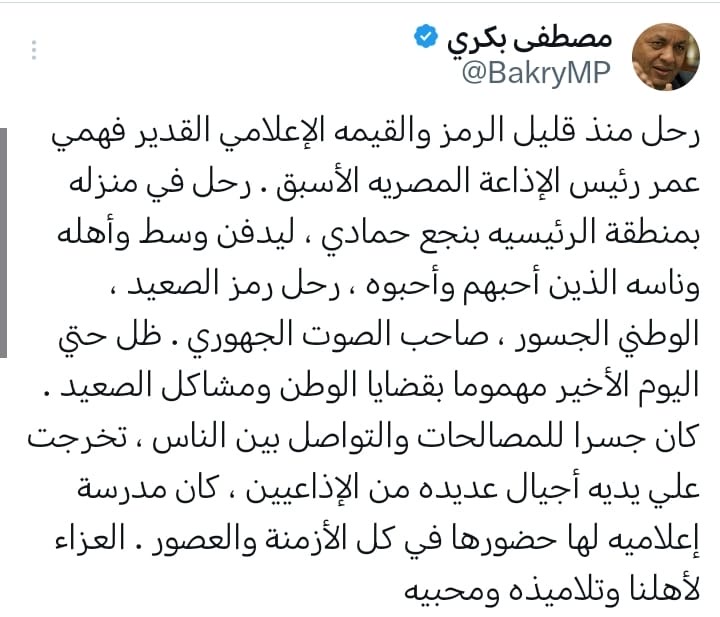 وكتب بكري فى تغريدة نشرها عبر صفحته الرسمية بمنصة "إكس" قائلا"رحل منذ قليل الرمز والقيمه الإعلامي القدير فهمي عمر رئيس الإذاعة المصريه الأسبق رحل في منزله بمنطقة الرئيسيه بنجع حمادي ، ليدفن وسط وأهله وناسه الذين أحبهم وأحبوه ، رحل رمز الصعيد ، الوطني الجسور ، صاحب الصوت الجهوري.