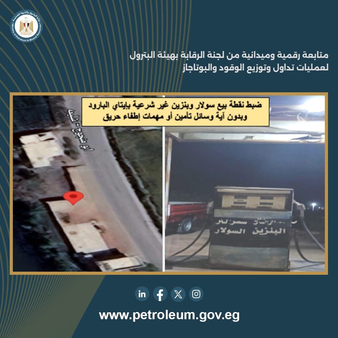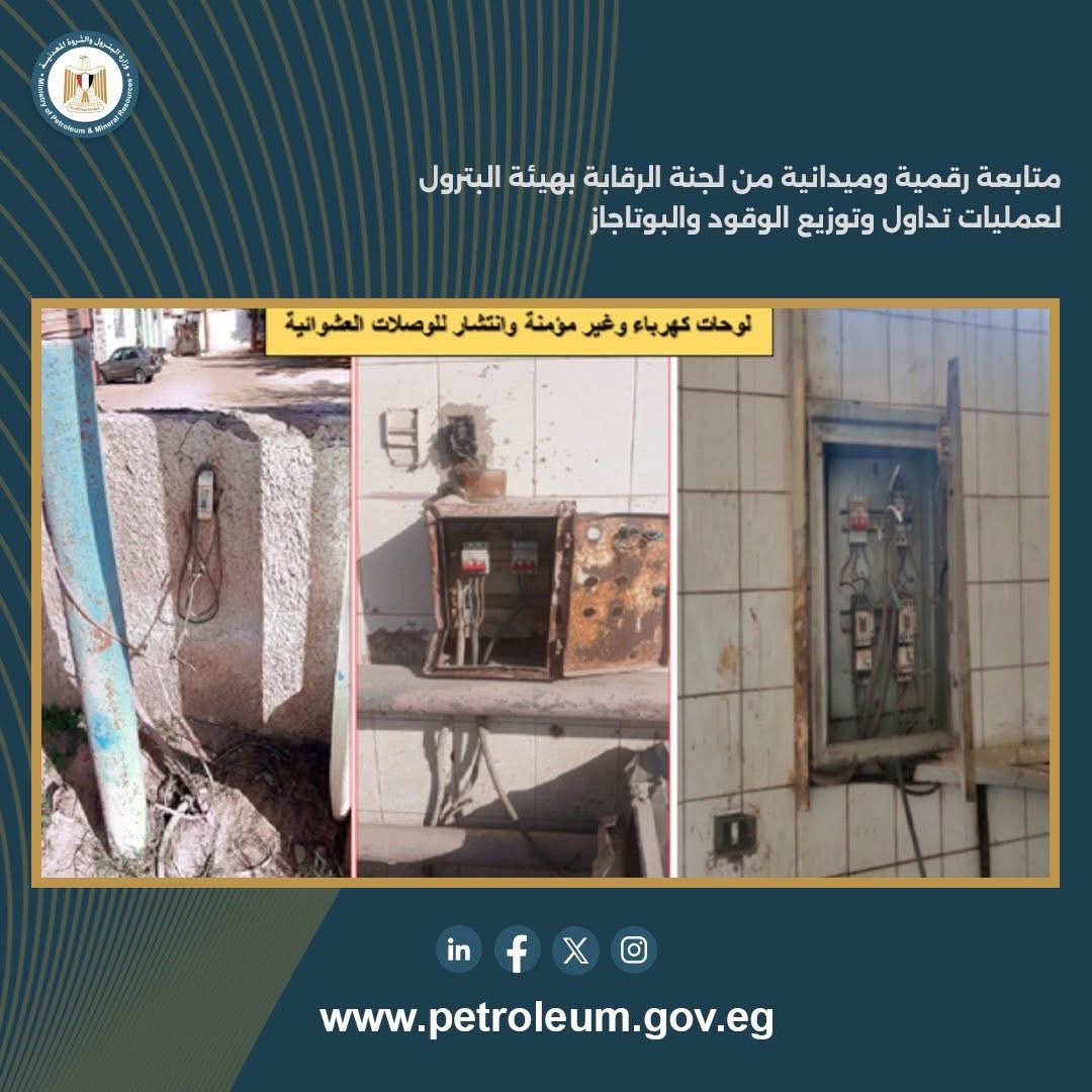 كما تم المرور والمراجعة على 30 محطة وقود بمحافظات(الجيزة-أسيوط-سوهاج-البحيرة-المنوفية-دمياط-الدقهلية-الاسماعيلية ) وتم رصد مخالفات منها عدم تأمين المخازن ووجود صهاريج خارج منظومة هيئة البترول للقياس الالي وانتشار المخلفات ، وتم مخاطبة الشركات المعنية لسرعة التلافي والإفادة.