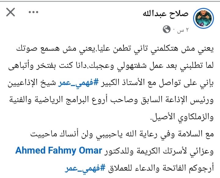 وكتب عبد الله عبر حسابه بموقع التواصل الاجتماعي "فيسبوك": "يعني مش هتكلمني تاني تطمن عليّا يعني مش هسمع صوتك لما تطلبني بعد عمل شفتهولي وعجبك. دانا كنت بفتخر وأتباهى بإني على تواصل مع الأستاذ الكبير فهمي عمر شيخ الإذاعيين ورئيس الإذاعة السابق وصاحب أروع البرامج الرياضية والفنية والزملكاوي الأصيل.. مع السلامة وفي رعاية الله يا حبيبي ولن أنساك ما حييت وعزائي لأسرتك الكريمة".