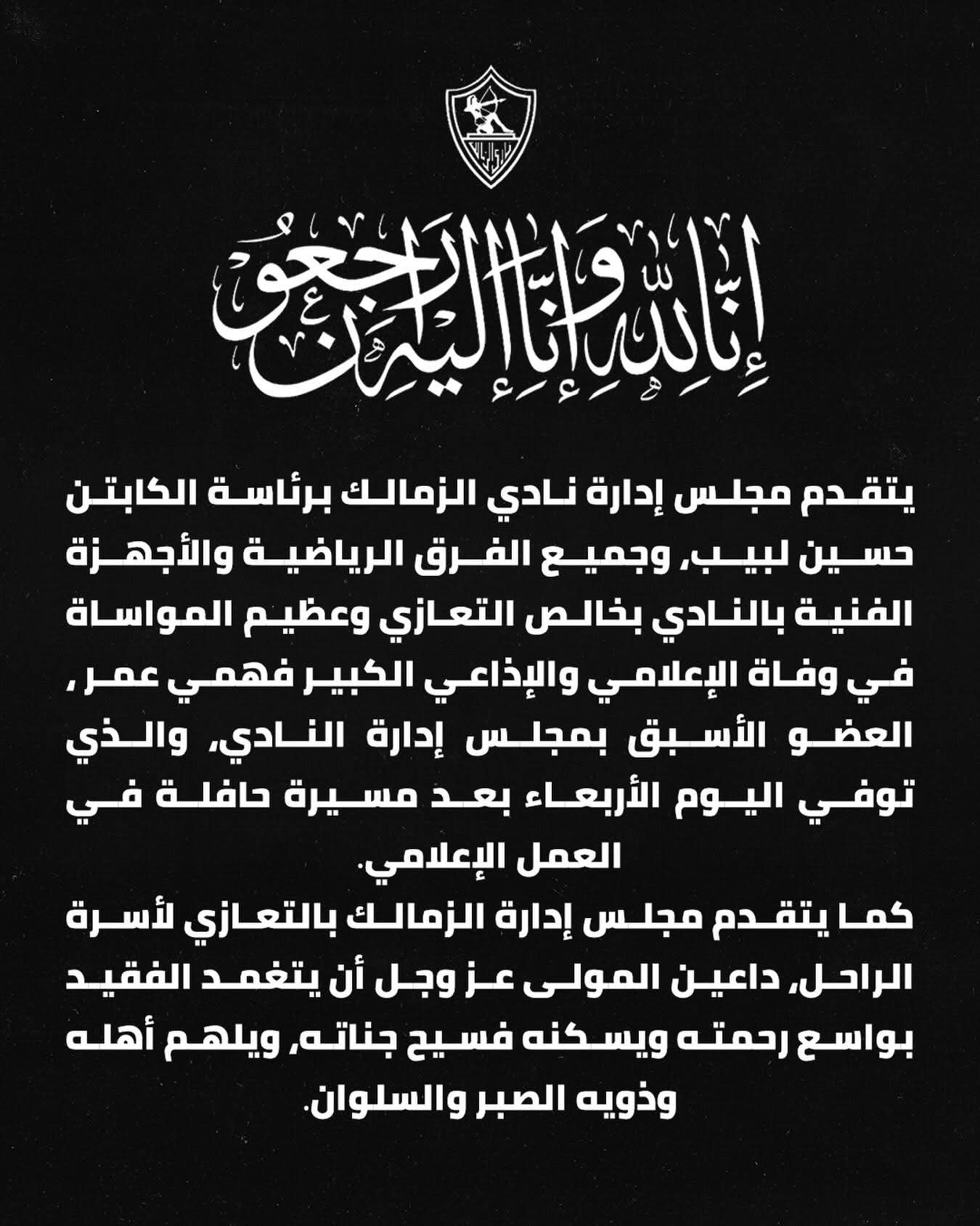 وتقدم مجلس إدارة الزمالك بخالص التعازي والمواساة إلى أسرة الفقيد ومحبيه، سائلين المولى عز وجل أن يتغمده بواسع رحمته، وأن يلهم أهله وذويه الصبر والسلوان.