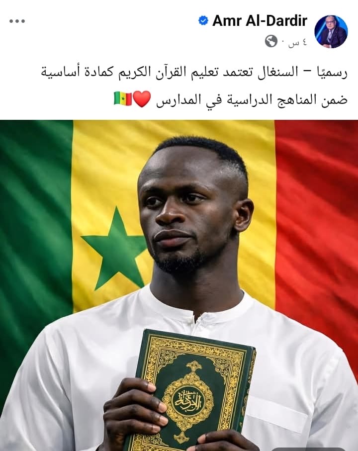 وكتب عمرو الدردير عبر حسابه علي فيسبوك "رسميًا – السنغال تعتمد تعليم القرآن الكريم كمادة أساسية ضمن المناهج الدراسية في المدارس"