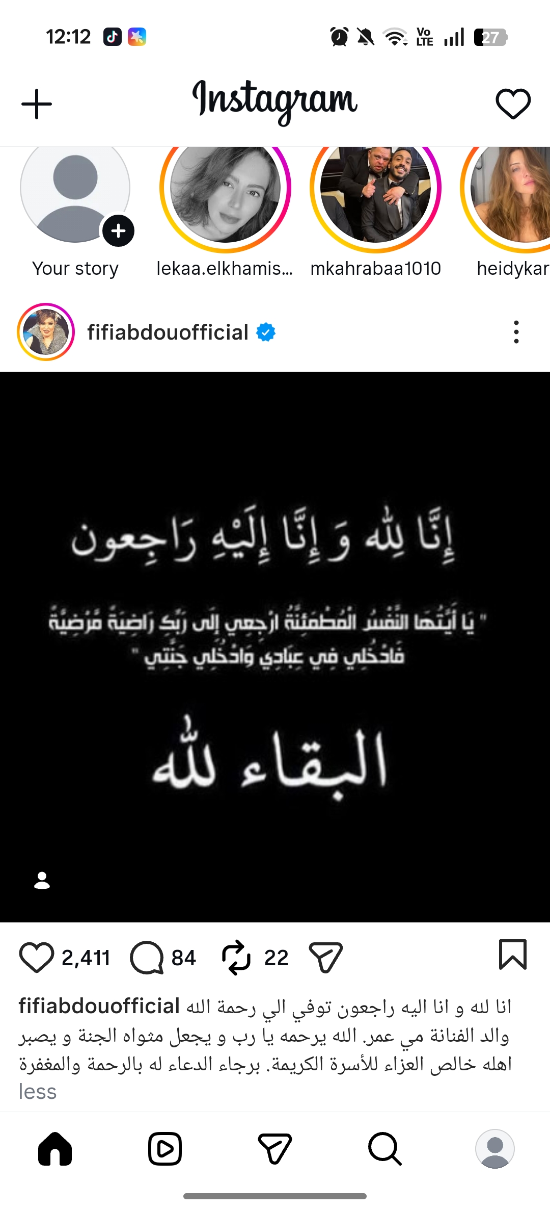 وكتبت فيفي عبده عبر إنستجرام: انا لله و انا اليه راجعون توفي الي رحمة الله والد الفنانة مي عمر الله يرحمه يا رب و يجعل مثواه الجنة و يصبر اهله خالص العزاء للأسرة الكريمة برجاء الدعاء له بالرحمة والمغفرة.