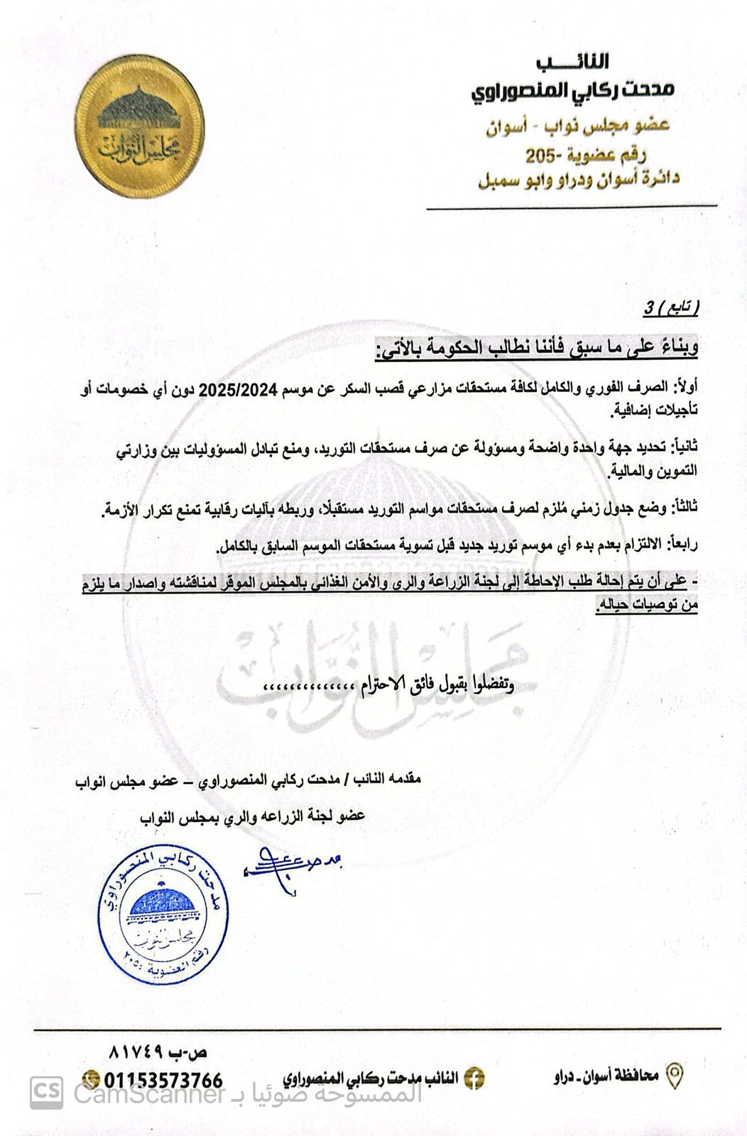 وطالب الحكومة بالصرف الفوري والكامل لكافة مستحقات مزارعي قصب السكر عن موسم 2024/2025 دون أي خصومات أو تأجيلات إضافية ، وتحديد جهة واحدة واضحة ومسؤولة عن صرف مستحقات التوريد، ومنع تبادل المسؤوليات بين وزارتي التموين والمالية ، ووضع جدول زمني مُلزم لصرف مستحقات مواسم التوريد مستقبلًا، وربطه بآليات رقابية تمنع تكرار الأزمة ، والالتزام بعدم بدء أي موسم توريد جديد قبل تسوية مستحقات الموسم السابق بالكامل ، على أن يتم إحالة طلب الإحاطة إلى لجنة الزراعة والري والأمن الغذائي بالمجلس الموقر لمناقشته واصدار ما يلزم من توصيات حياله.