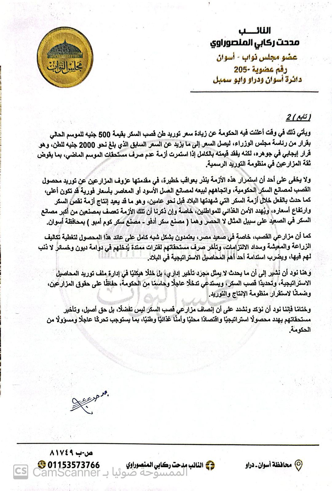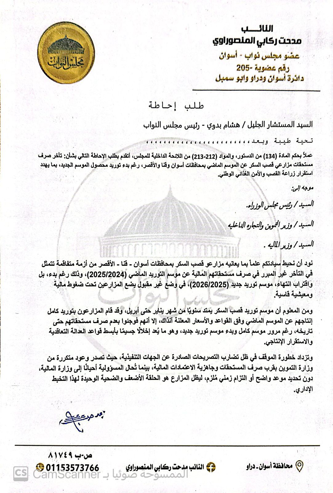 وقال: نود أن نحيط سيادتكم علماً بما يعانيه مزارعودي قصب السكر بمحافظات أسوان - قنا - الأقصر من أزمة متفاقمة تتمثل في التأخر غير المبرر في صرف مستحقاتهم المالية عن موسم التوريد الماضي (2024/2025)، وذلك رغم بدء، بل واقتراب انتهاء، موسم توريد جديد (2025/2026)، في وضع غير مقبول يضع المزارعين تحت ضغوط مالية ومعيشية قاسية.