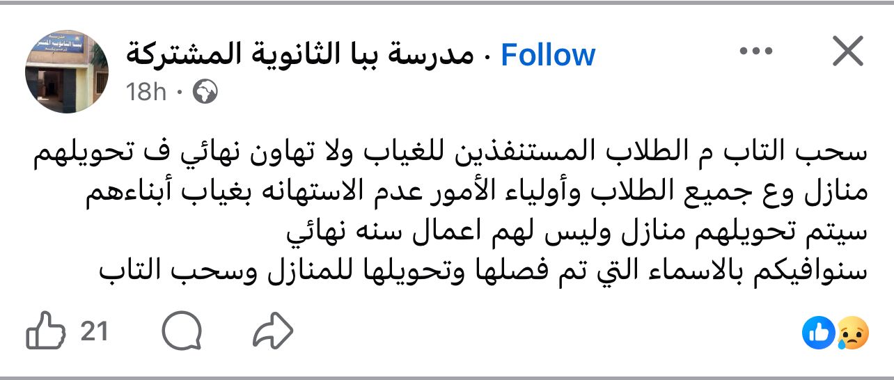 أعلنت الصفحة الرسمية لمدرسة ببا الثانوية المشتركة بمحافظة بني سويف على موقع التواصل الاجتماعي فيس بوك ، أنه تقرر سحب التابلت من طلاب المرحلة الثانوية المستنفذين للغياب