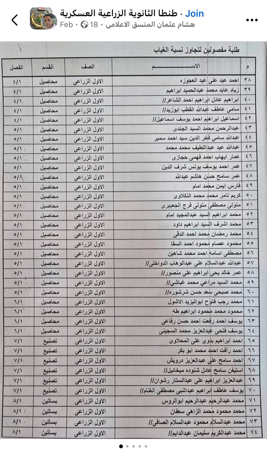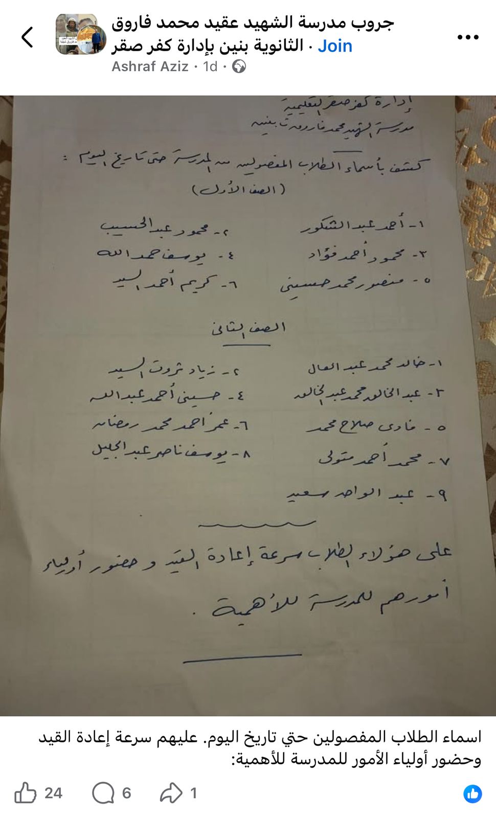 نشرت الصفحات الرسمية لعدد من المدارس على فيس بوك ، قرارات فصل جماعية للعشرات من الطلاب ، بسبب تجاوز نسب الغياب المقررة .