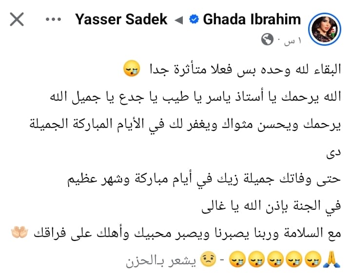 وكتبت غادة إبراهيم عبر حسابها الرسمى على "فيسبوك": "البقاء لله وحده بس فعلا متأثرة جدا، الله يرحمك يا أستاذ ياسر يا طيب يا جدع يا جميل الله يرحمك ويحسن مثواك ويغفر لك فى الأيام المباركة الجميلة دى".