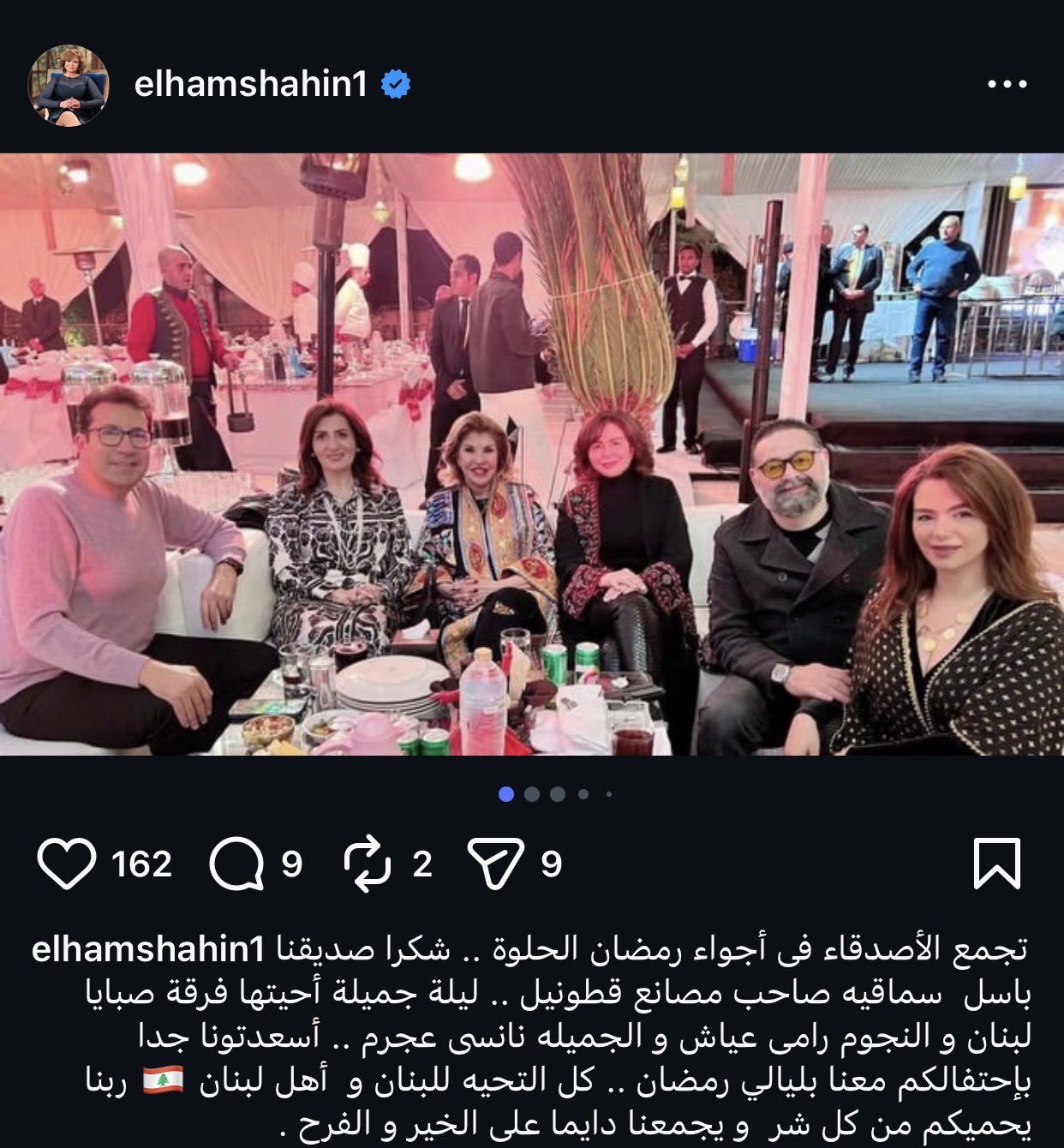 وعلقت إلهام شاهين على الصور قائلة: “تجمع الأصدقاء فى أجواء رمضان الحلوة .. شكرا صديقنا باسل سماقية .. ليلة جميلة أحيتها فرقة صبايا لبنان والنجوم رامى عياش والجميله نانسى عجرم .. أسعدتونا جدا بإحتفالكم معنا بليالي رمضان .. كل التحيه للبنان و أهل لبنان ربنا يحميكم من كل شر ويجمعنا دايما على الخير و الفرح”.