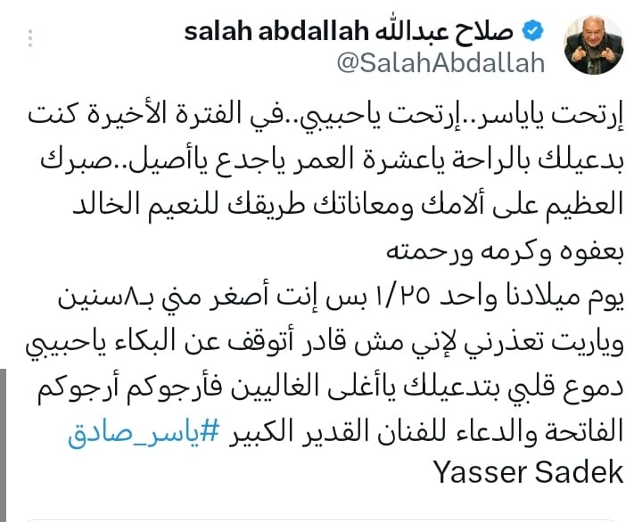 وكتب صلاح عبد الله عبر حسابه علي "x": "إرتحت يا ياسر..إرتحت ياحبيبي..في الفترة الأخيرة كنت بدعيلك بالراحة ياعشرة العمر ياجدع ياأصيل..صبرك العظيم على ألامك ومعاناتك طريقك للنعيم الخالد بعفوه وكرمه ورحمته يوم ميلادنا واحد ١/٢٥ بس إنت أصغر مني بـ 8 سنين وياريت تعذرني لإني مش قادر أتوقف عن البكاء ياحبيبي دموع قلبي بتدعيلك ياأغلى الغاليين فأرجوكم أرجوكم الفاتحة والدعاء للفنان القدير الكبير ياسر صادق ".