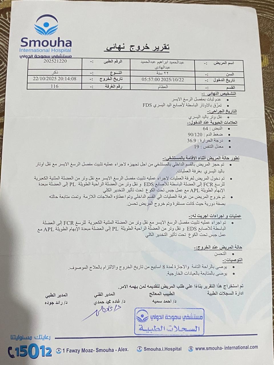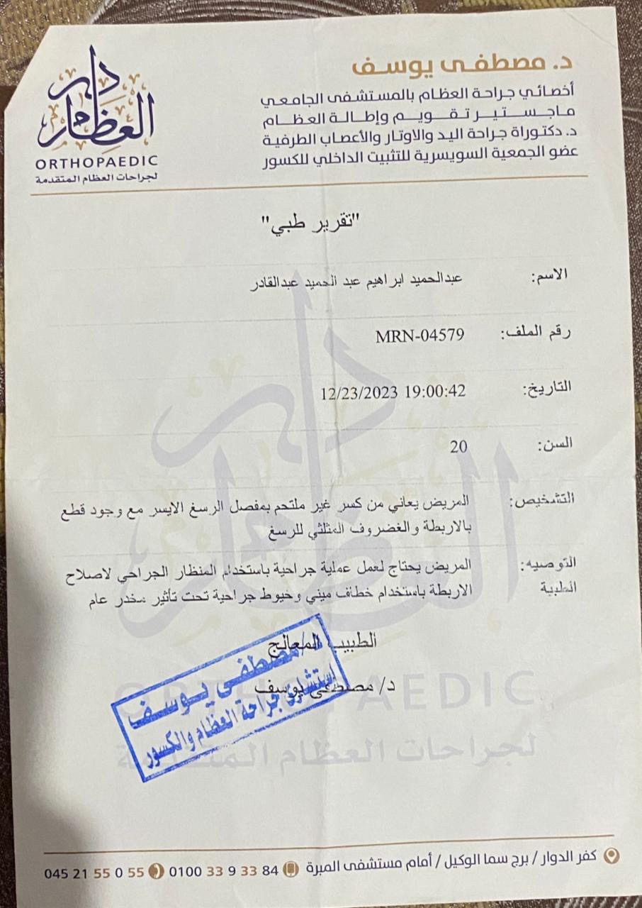 وقال فارس:“تم تحويلي لطبيب في القاهرة، وفضلت مستني من شهر 12 لسنة 2023 لحد شهر 2 لسنة 2024 عشان العملية تتعمل، وبعد أول غيار فوجئت إن العملية اتعملت جراحة مفتوحة مش منظار، رغم إن التقارير كانت بتوصي بمنظار.”