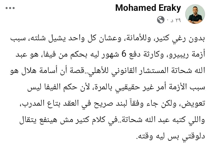 وكتب عراقي عبر حسابه علي فيسبوك "للعلم :" بدون كلام كتير، وللأمانة، وعشان كل واحد يشيل شلته، سبب أزمة ريبيرو، وكارثة دفع 6 شهور ليه بحكم من فيفا، هو عبد الله شحاتة المستشار القانوني للأهلي..قصة أن أسامة هلال هو سبب الأزمة أمر غير حقيقيي بالمرة، لأن حكم الفيفا ليس تعويض، ولكن جاء وفقآ لبند صريح في العقد بتاع المدرب، واللي كتبه عبد الله شحاتة..في كلام كتير مش هينفع يتقال دلوقتي بس ليه وقته"