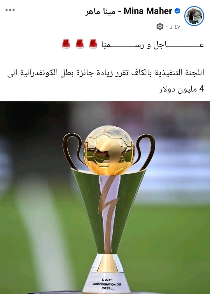 وكتب الإعلامي مينا ماهر عبر حسابه علي فيسبوك "عــاجل و رسـميًا اللجنة التنفيذية بالكاف تقرر زيادة جائزة بطل الكونفدرالية إلى 4 مليون دولار".