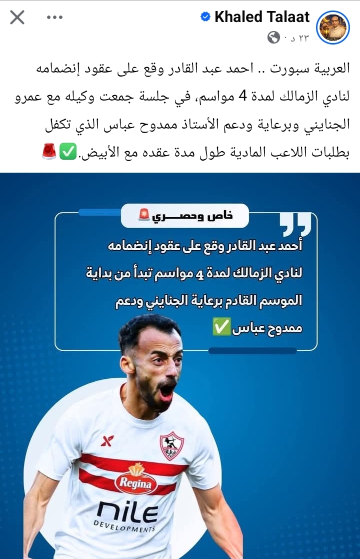 وكتب خالد طلعت عبر حسابه علي فيسبوك "العربية سبورت .. أحمد عبد القادر وقع على عقود إنضمامه لنادي الزمالك لمدة 4 مواسم، في جلسة جمعت وكيله مع عمرو الجنايني وبرعاية ودعم الأستاذ ممدوح عباس الذي تكفل بطلبات اللاعب المادية طول مدة عقده مع الأبيض".