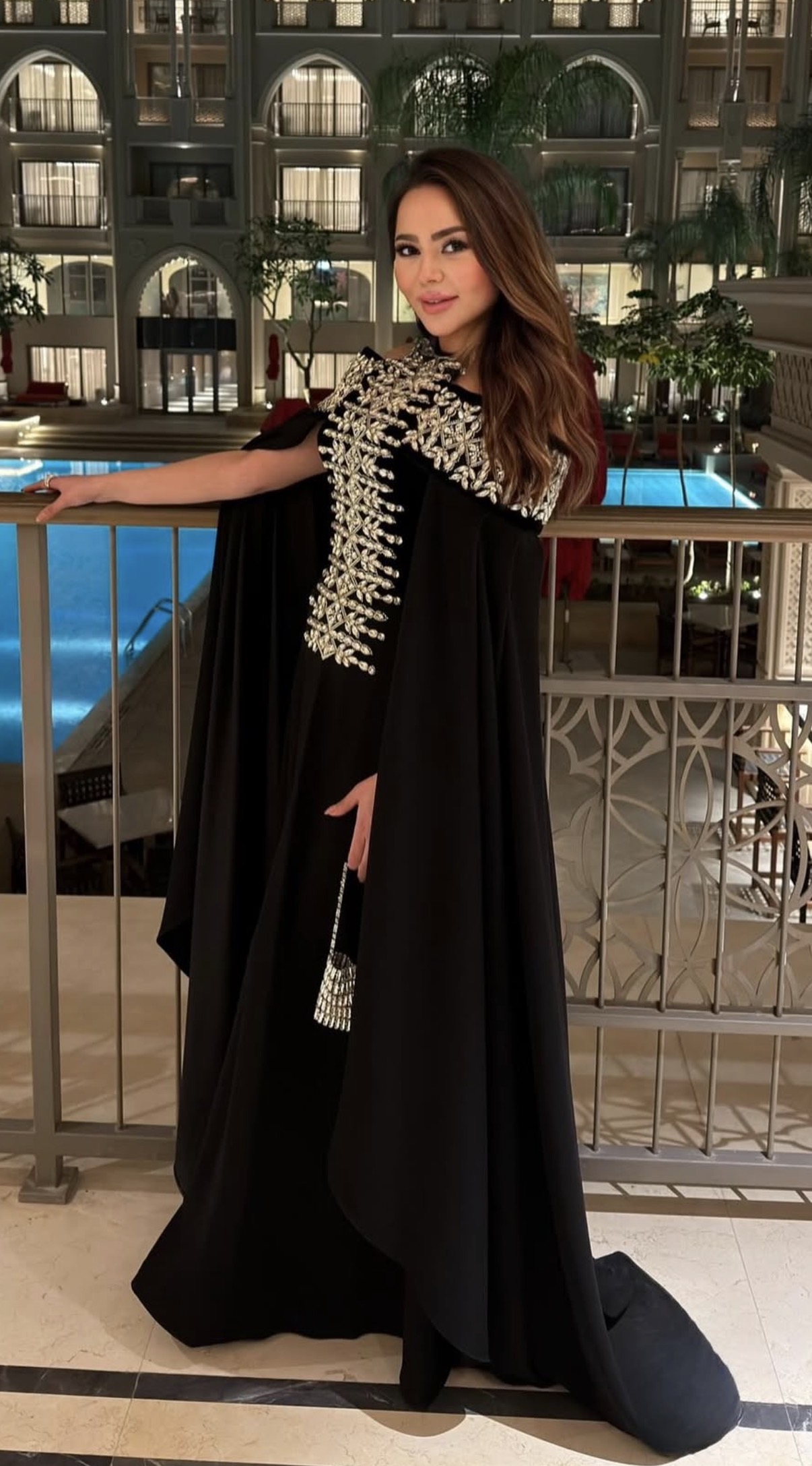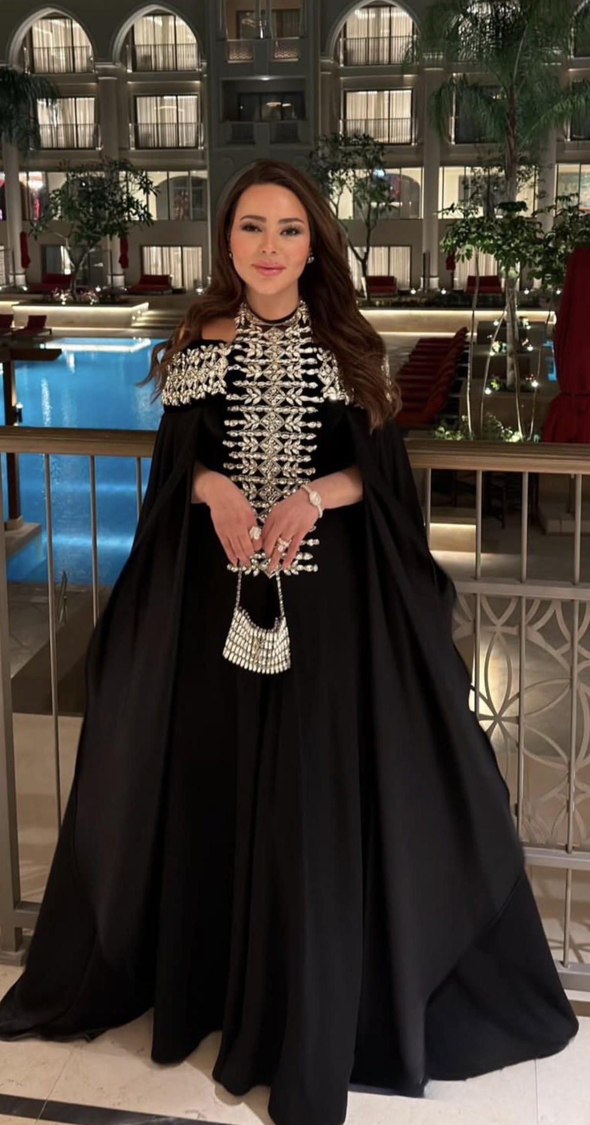 لفتت أسما إبراهيم الأنظار بأناقتها وذوقها الراقي، حيث ارتدت فستان طويل يشيه العباءة و اتسم التصميم باللون الأسود المطرز.
