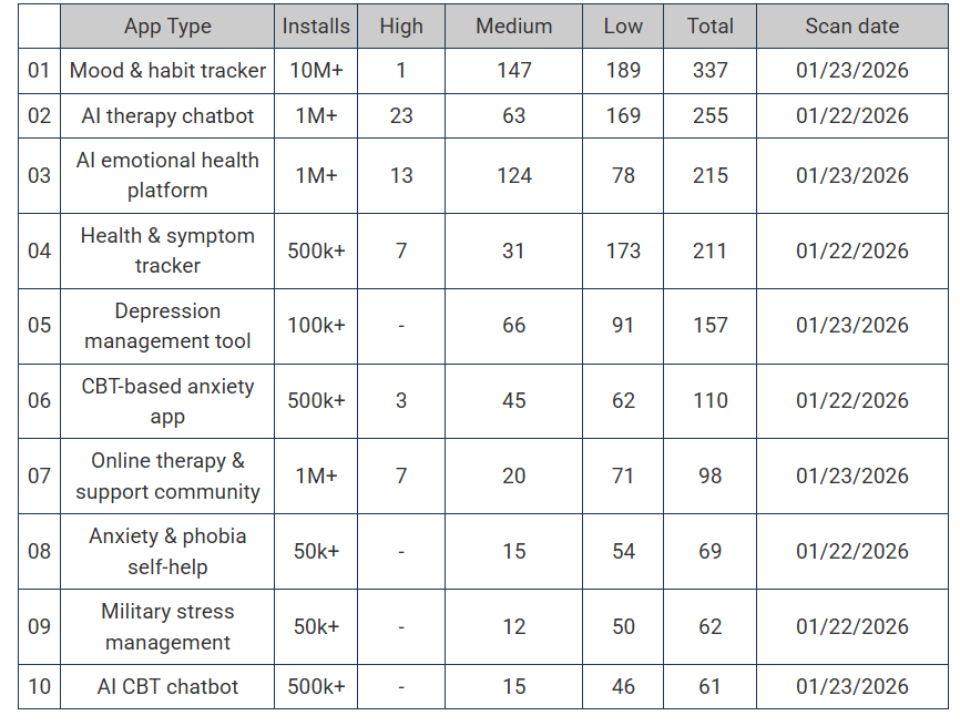 وأوضح الباحثون أن الفحص كشف عن أكثر من 1500 ثغرة أمنية في عشرة تطبيقات للصحة النفسية، منها 54 ثغرة عالية الخطورة و538 متوسطة و983 منخفضة.